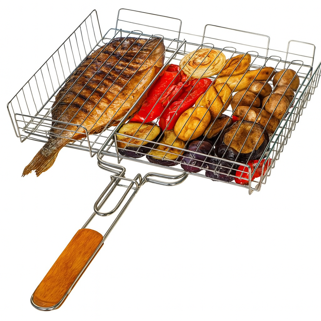Решітка для гриля 43x33x7.5 см з нержавіючої сталі з дерев'яною ручкою для мангалу та барбекю