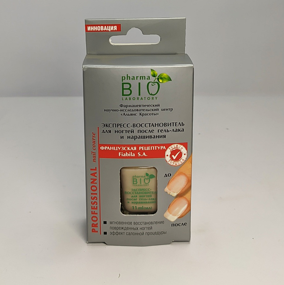 Pharma BIO Laboratory являє експрес-відновник для нігтів після гель-лаку і нарощування. Він миттєво відновлює пошкоджені нігті, створюючи ефект салонної процедури в домашніх умовах. Створений за французькою рецептурою Fiabila S. A.